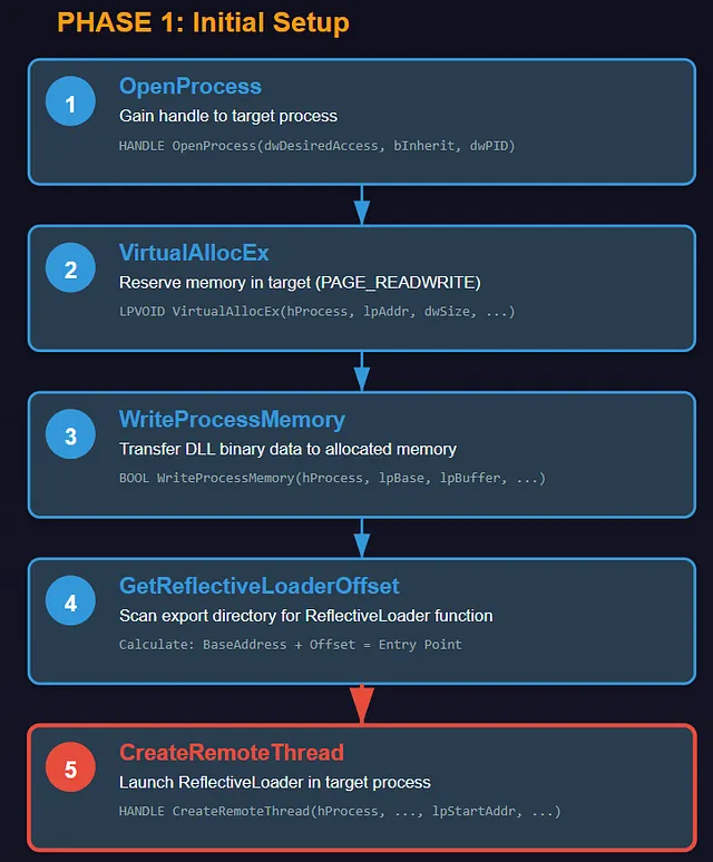 Phase 1: OpenProcess → VirtualAllocEx → WriteProcessMemory → GetReflectiveLoaderOffset → CreateRemoteThread