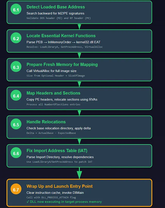 6.7: Wrap Up and Launch Entry — Clear the instruction cache if required, invoke DllMain (or equivalent) with flags like DLL_PROCESS_ATTACH, perform cleanup, and hand back execution flow.
