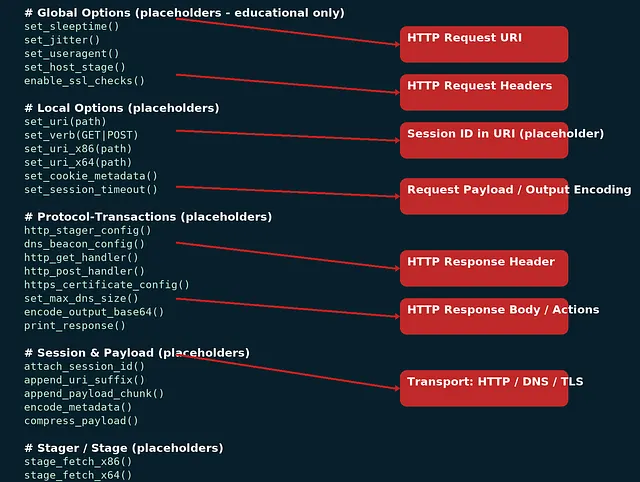 Malleable C2 Profile structure: Global Options, Local Options, Protocol-Transactions, Session & Payload